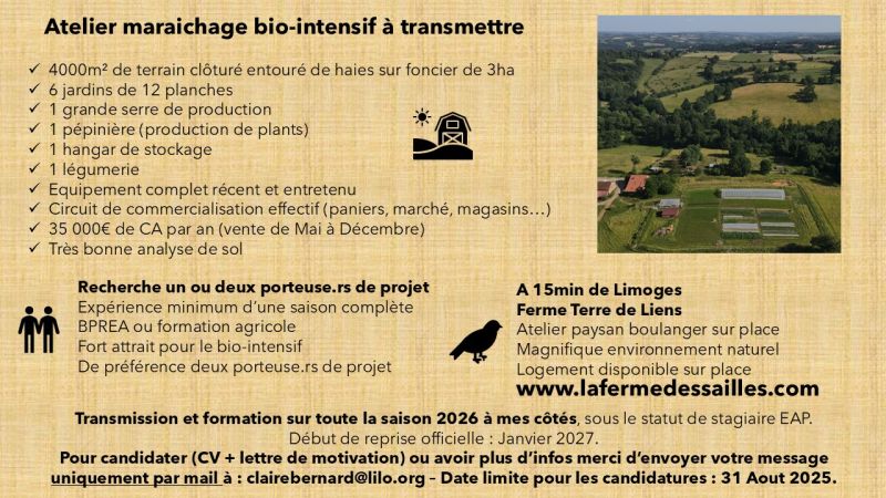 Aujourd’hui nous avons envie de changer de projet avec mon compagnon, ralentir la cadence, et voguer vers de nouveaux horizons. Deux repreneurs ont été trouvés pour la partie boulange, et je suis en recherche de deux personnes pour le maraichage. Nous souhaitons transmettre/former sur la saison 2026, pour partir début 2027 après 7 ans d’installation.